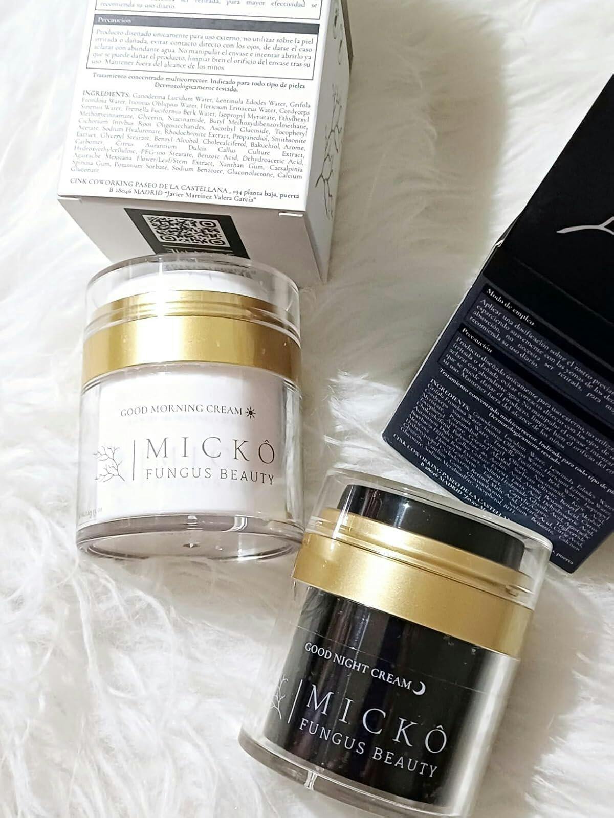 No conocía esta marca española, Mickô, y aunque creo que sólo comercializan estas dos cremas, me parece muy prometedora. Ambas cremas, tanto la de día como la de noche, son veganas, aptas para todo tipo de piel e incluyen hongos medicinales en su composición. El packaging es muy bonito, la crema de día en tonos blancos y la de noche en tonos negros, con una estética como japonesa. Los botes de ambas también son bastante exclusivos, con una tapa transparente y un dosificador airless que impide que la crema se contamine.